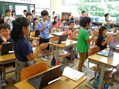 【2年生】1枚目の写真は、音楽の「はくやドレミとなかよし」の学習です。みんな机の上にタブレットPCを載せていますね。実は、一人一人元気に歌う様子を録画していたのです。笑顔いっぱいでした。