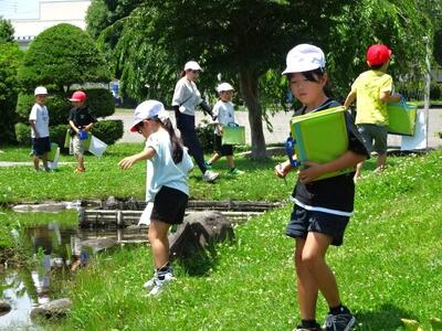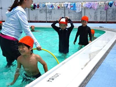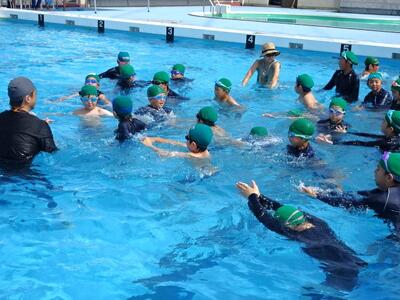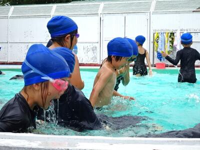 【1年生】1枚目の写真は、体育のプール活動の様子です。二人1組で、動きながら顔を水につける練習をしています。「あぎるのさんぽ ぶくぶくぱっ」という掛け声が響いていました。