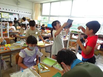 【5年生】1枚目の写真は、図画工作の「あんなところがこんなところに」の学習の様子です。先週、実際に変身させて写真に撮っておいたものを見て、作品の良さを確認し合っています。