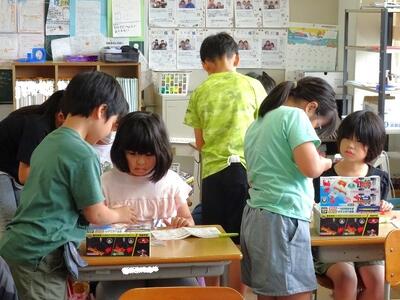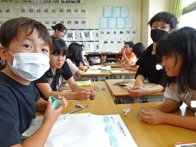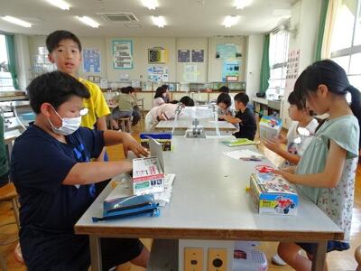 【4年生】1枚目の写真は、理科の「電気のはたらき」の学習の様子です。今日は、実験のセットを使って、乾電池の向きを変えると、プロペラの回り方はどうなるのかを調べました。