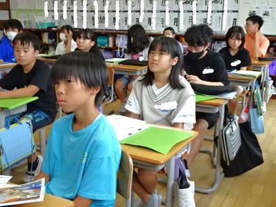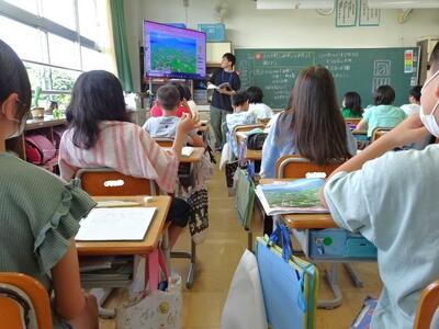【4・5・6・7組】1枚目の写真は、国語の学習の様子です。「スイミー」の実際の世界のイメージをつかむために、大型提示装置で海の中の様子を観察しています。