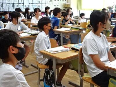 【6年生】1枚目と2枚目の写真は、外国語の「Welcome to Japon」の学習の様子です。今日は、いろいろな国の特徴を知らせるために、どんなスピーチをしたらよいか、告別のカードを使って紹介し合っていました。