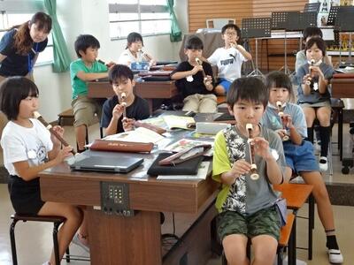 【2年生】1枚目の写真は、音楽の時間の様子です。机の上にタブレットを置いていますね。これは、自分の歌っている場面を撮影しているのです。姿が映るように調節して録画しました。
