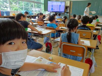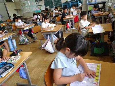 【1年生】さくら市では、1・2年生の国語の時間に20時間をプラスして、MIM(国語の読みの時間)を行っています。1枚目の写真は、MIMの確認テストの様子です。集中して問題をといていました。