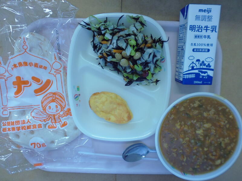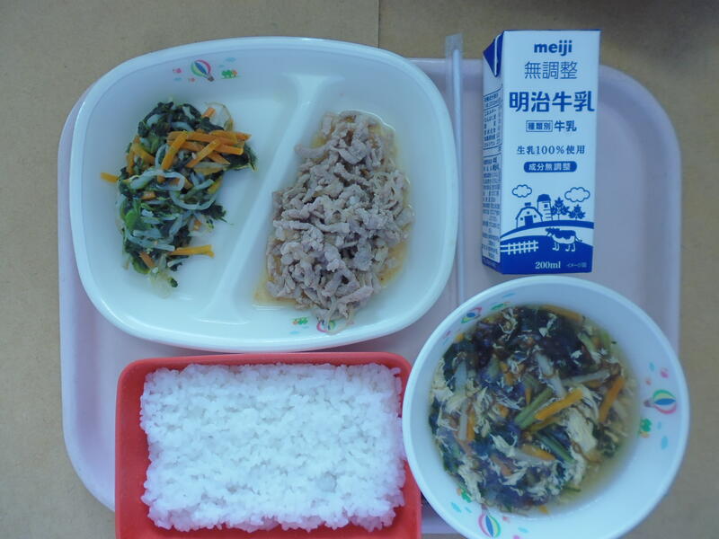 明日、6月15日は栃木県民の日です。今日は一足先に県民の日献立です。栃木県で作られたものが沢山入っています。ほうれん草、ニラ、味噌、いちご、豚肉、牛乳です。