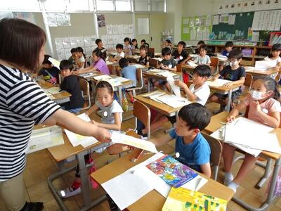 【4年生】1枚目と2枚目の写真は、国語の「一つの花」の学習の様子です。4年生にとっては、やや長い物語です。登場人物や情景などについて、文章を捉えながら理解していきます。