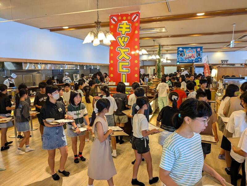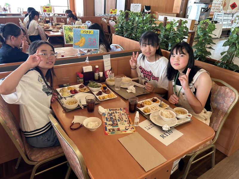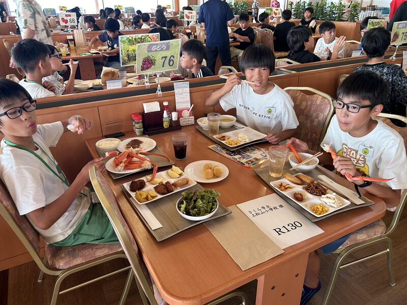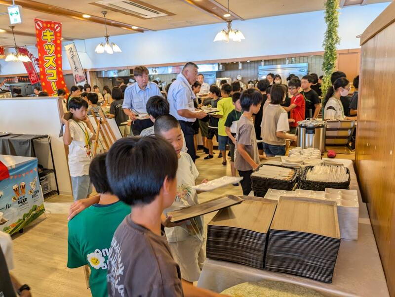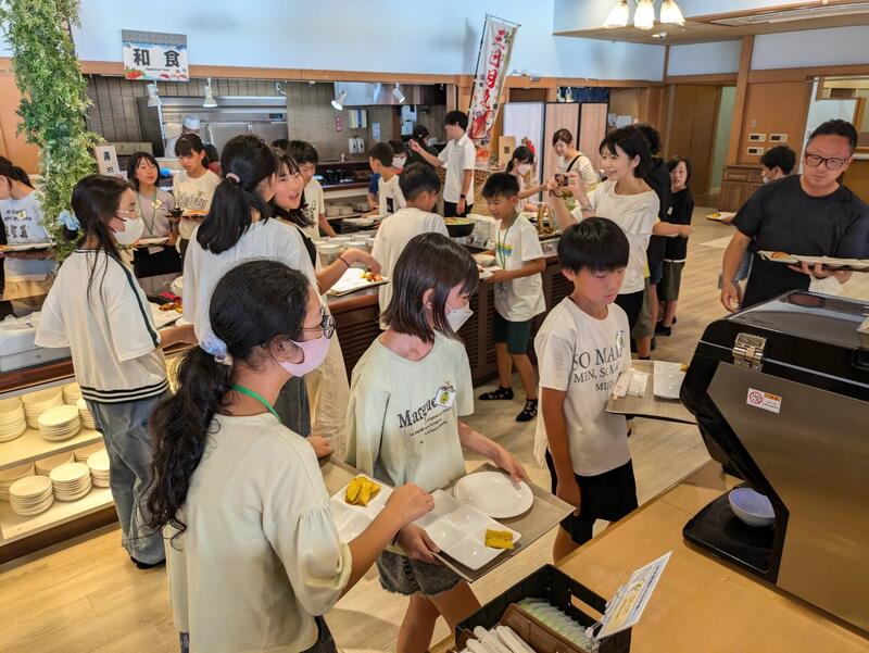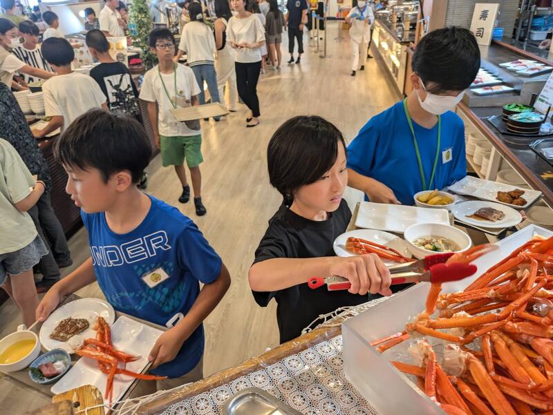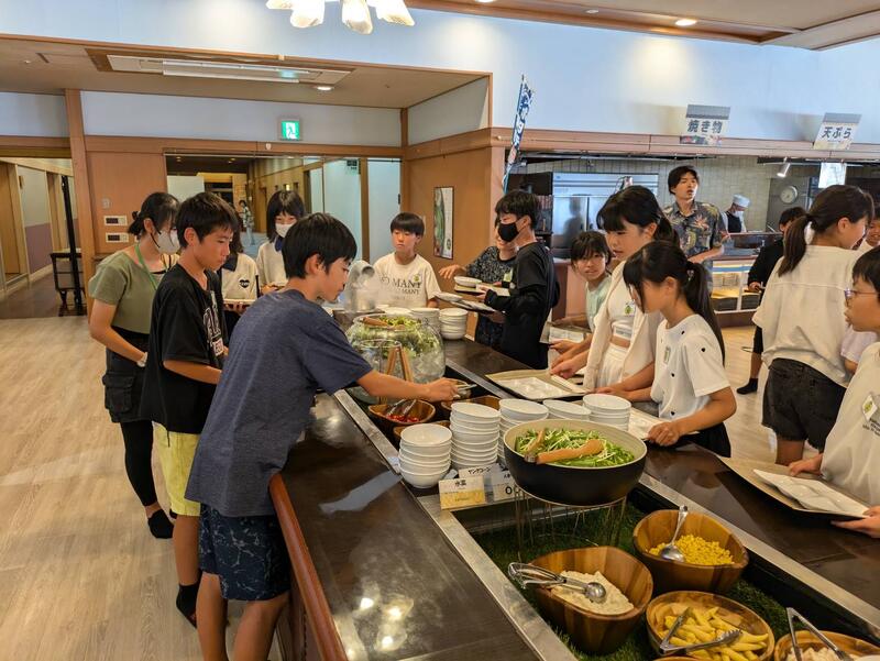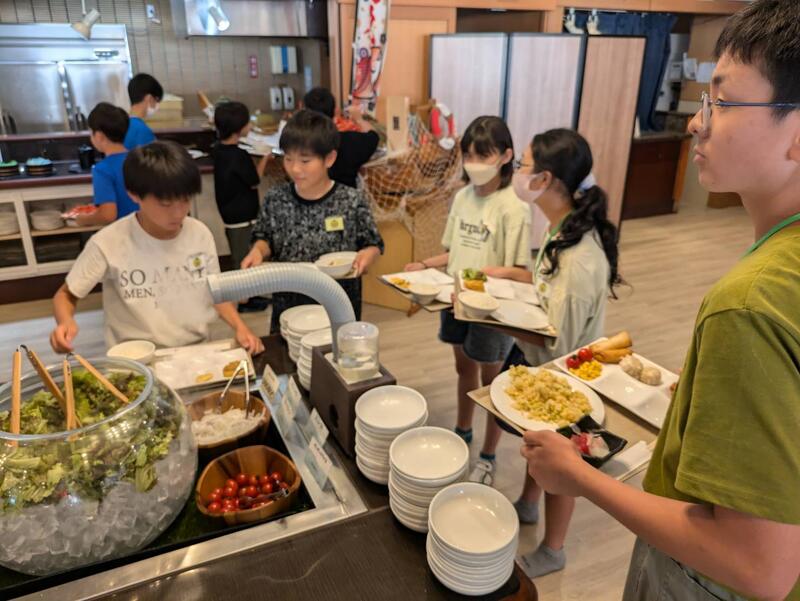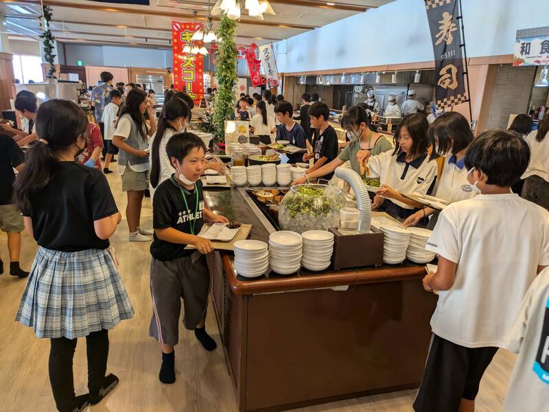 ホテルに到着し、すぐに夕食になりました。バイキングなので、子どもたちも大喜びです。