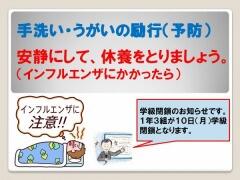 7日金曜日にインフルエンザによる欠席者、また発熱のため早退する児童が増加しました。今回は1年3組が10日月曜日学級閉鎖となりますが、お子様の健康管理に十分ご留意ください。