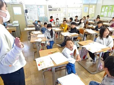 【1年生】1枚目と2枚目の写真は、図画工作の「せんせい あのね」の学習の様子です。先生に知らせたいことを絵に表しました。絵の具を使うのも2回目になります。しっかりと準備をして彩色していました。
