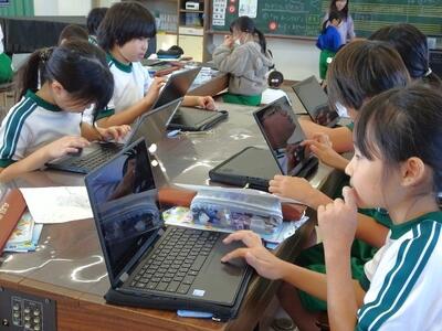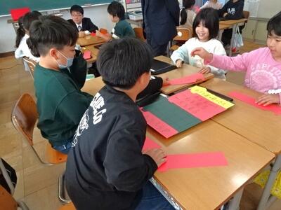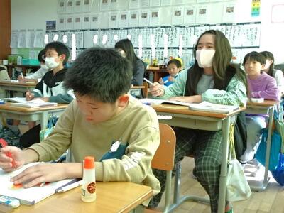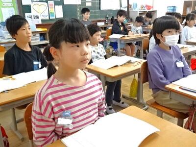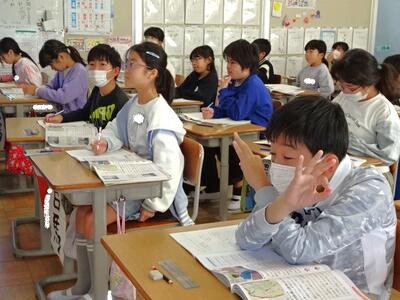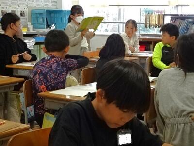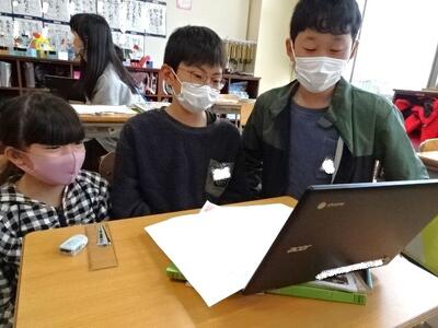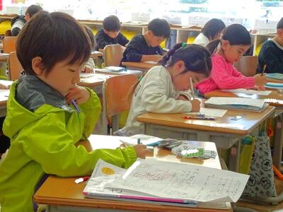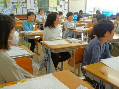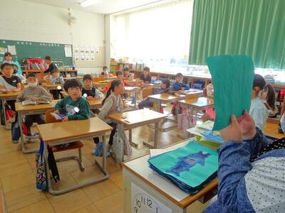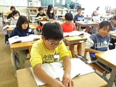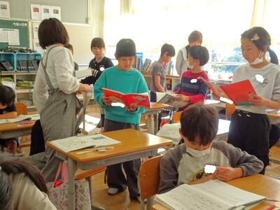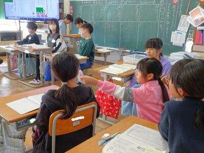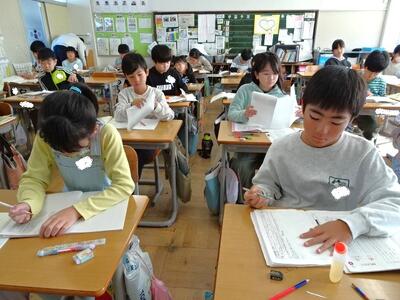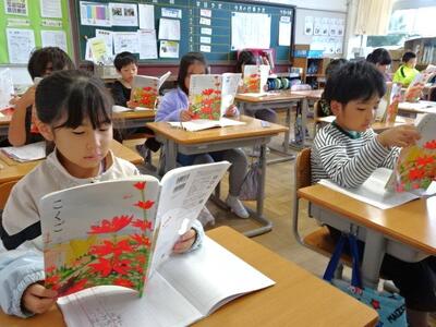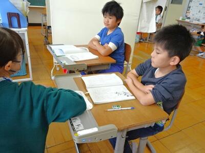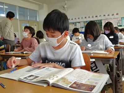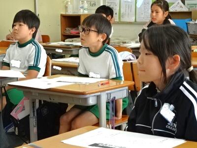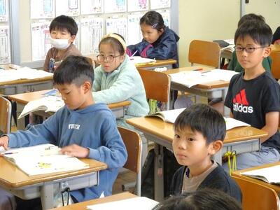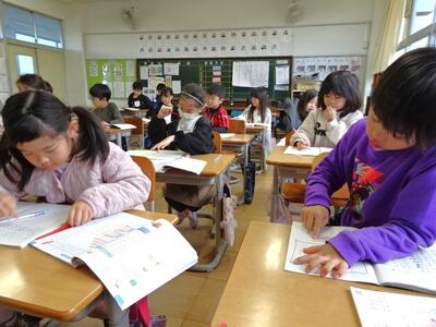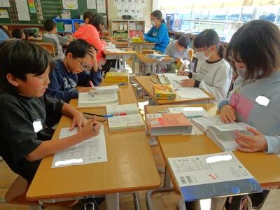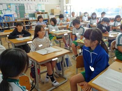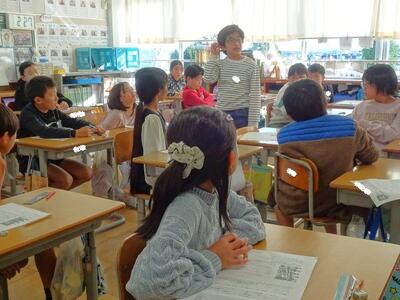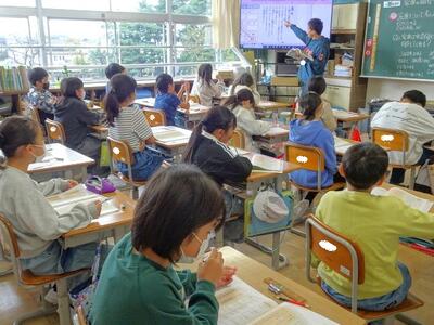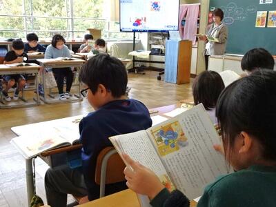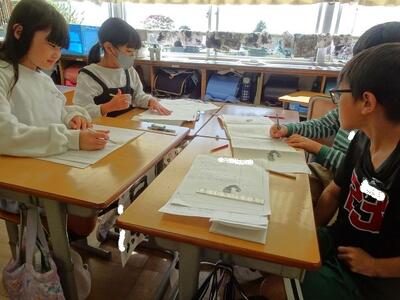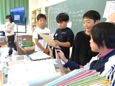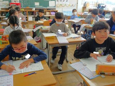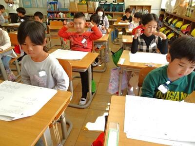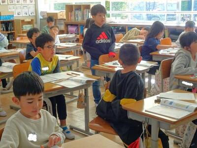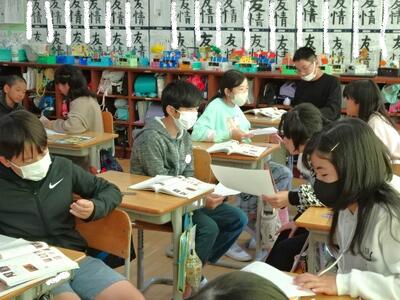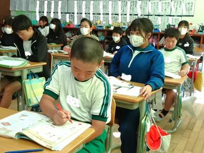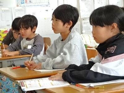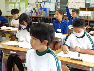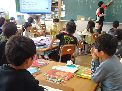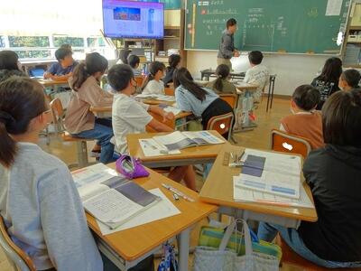 【4年生】1枚目の写真は、国語の「ごんぎつね」の学習の様子です。長文の物語なのですが、子どもたちは物語の世界に浸りながら、一文一文を丁寧に、どんな情景なのかを深く読み取っていました。