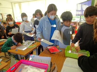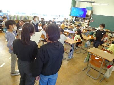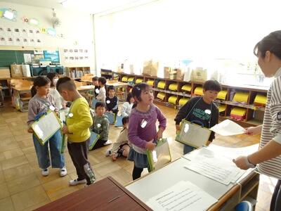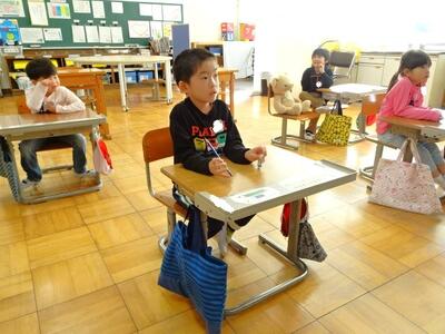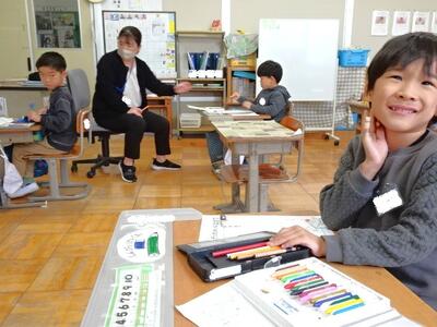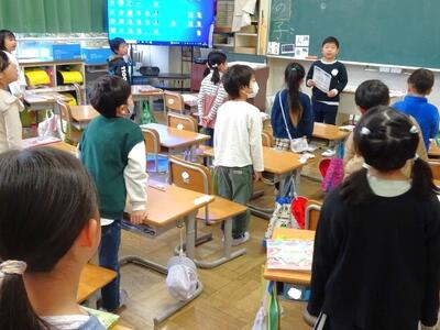 【1年生】1枚目の写真は、生活科の学習の様子です。今週末に迫ってきた幼稚園生や保育園生との交流会に向けて、特別教室を案内する練習を行いました。