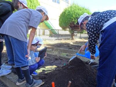 【5年生】1枚目と2枚目の写真は、理科の「流れる水のはたらき」の学習の様子です。今日は、畑に山を作り蛇行する川を作って水を流していきます。タブレットでその様子を記録して、後でも見返すことができるようにしています。