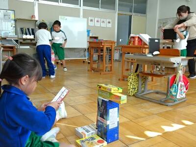 【4・5・6・7組】1枚目の写真は、算数の学習の様子です。箱の形の学習ですが、まずはどのくらい高く積むことができるのかに挑戦しました。