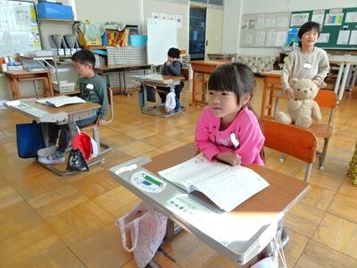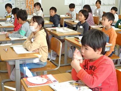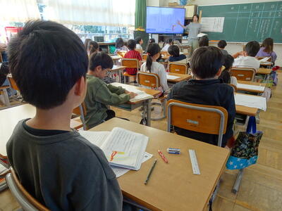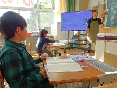 【4・5・6・7組】1枚目の写真は、国語の時間の様子です。漢字を習得するために、大型提示装置で書き順を学習しています。