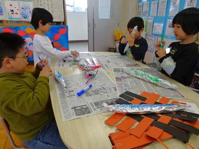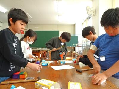 【4年生】1枚目の写真は、図画工作の「ギコギコ トントン クリエイター」の学習の様子です。1枚の板をのこぎりで切り取っていき、組み合わせて作品に仕上げていきます。曲線が難しいので、直線でできるように調整しています。