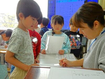 【2年生】1枚目の写真は、算数の時間の様子です。いよいよかけ算九九の検定が始まりました。これまでに習った2の段と5の段に早速挑戦していました。合格の免許証を目指して頑張ります。