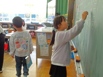 【2年生】1枚目の写真は、算数の「かけざん」の学習の様子です。今日はいよいよ4の段の学習をしていました。かけ算の考え方にも慣れてきて、どのように計算すればよいかしっかり理解しています。