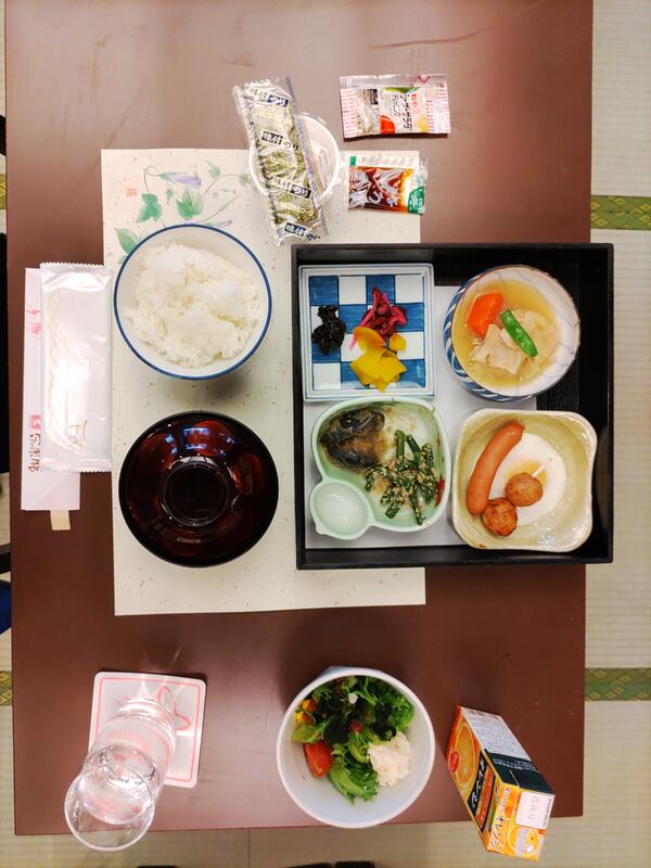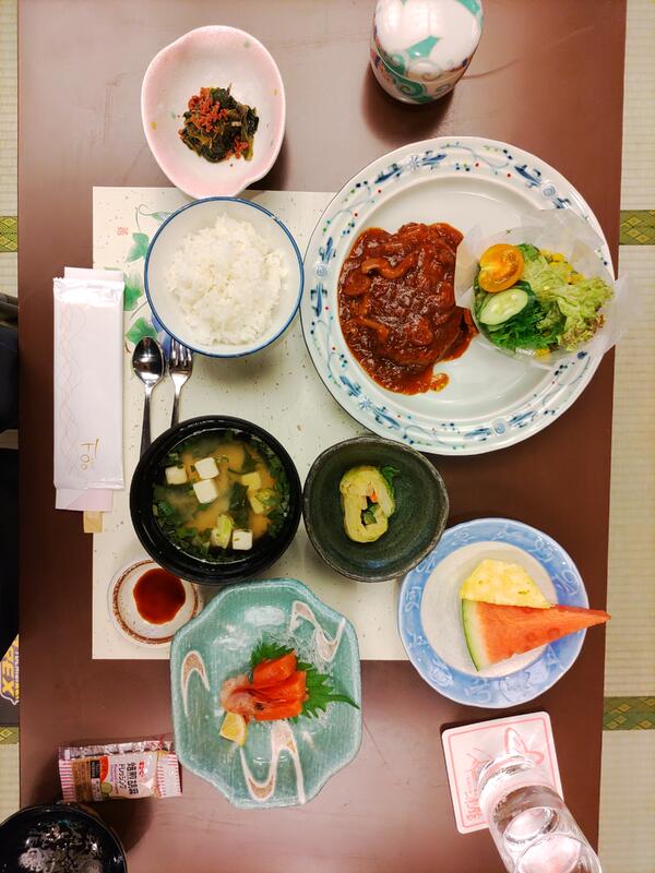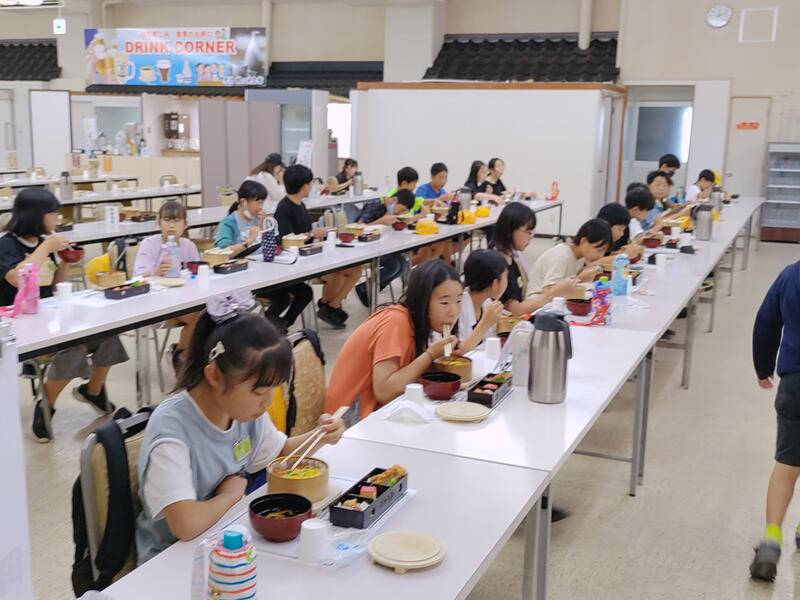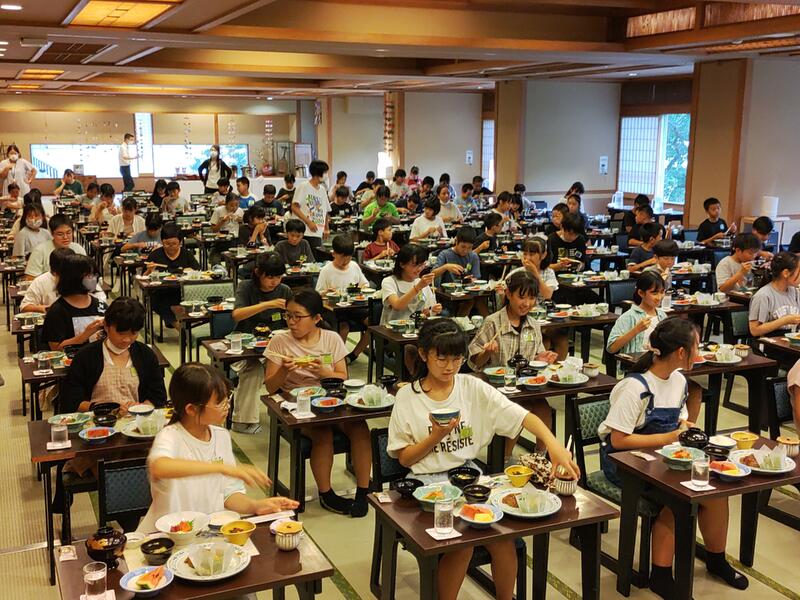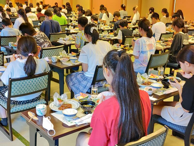 今日の宿泊場所である栄楽館に着き、夕食をいただいています。ホテルの方に到着のあいさつもできました。おかわりをして、たくさん食べていました。