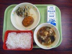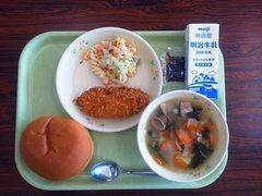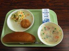 メンチカツは、衣がサクサクにあがっていて、中はとてもジューシーでおいしいです。色鮮やかなサラダは、歯ごたえがあり、コーンの甘味が感じられます。クラムチャウダーは生クリームが入っていて、とてもクリーミーな味わいです。クラムチャウダーに入っている あさり には、鉄分が多く含まれています。貝類が苦手な児童も、クラムチャウダーのようなミルク味になると、ぐっと食べやすくなります。