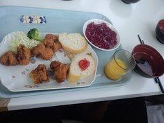初登場の鶏肉のトマト煮は、鶏肉とトマトの酸味がマッチして、とてもおいしいです。人参、キャベツ、とうもろこしの入ったマカロニサラダは彩りがよく、さっぱりとした味わいです。冷たいゼリーはあじさい色でほんのりした甘さのうれしいデザートです。