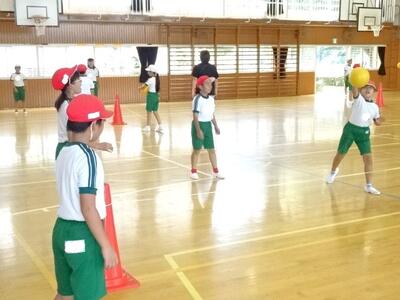 【3年生】1枚目と2枚目の写真は、体育のゴール型のゲーム「タグタグビー」の活動の様子です。これまでのパスの練習から、だんだんとゲームに移行してきました。ルールを確認しながら動き回っています。