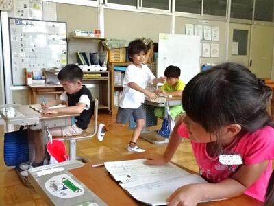 【1年生】夏休みあけ、1年生の教室では新しい教科書やドリルが配られていました。名前を書いたり、中身をチラチラと見たりしながら、先生と一緒に確認をしていました。