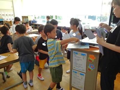 【6年生】6年生の教室には朝の早い時間帯に行きました。ちょうど、夏休みの宿題を提出している場面でした。みんな自信ありげな表情で提出していました。また、新しい教科書を各教室に届けるのも、6年生がしっかりと行ってくれました。ありがとう。