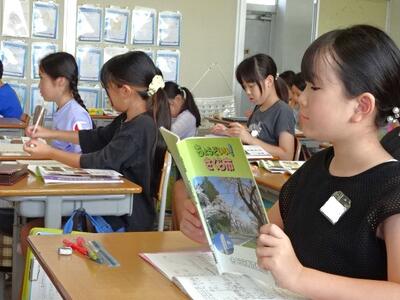 【4・5・6・7組】1枚目の写真は、ブックトークをしている様子です。自分が選んだ本を、理由を付けて紹介していました。
