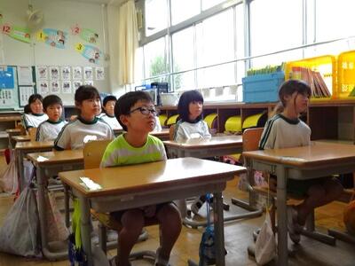 18日(木)に、6年生を対象にして着衣水泳を実施しました。日頃は消防署に勤務する水難学会の皆様に来ていただき、万が一水の中に入ってしまったときの対処方法について教わりました。大切なのは「ういてまて」ということです。子どもたちは、ペットボトルなどを持ちながら、浮いて待つ方法を練習し、最後は3分間、体を浮かせることにチャレンジしました。濡れた衣服の重さや動きづらさ、そして体を浮かせる方法を体験し、まさに命を守る学習となりました。