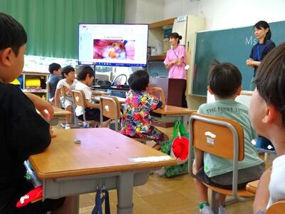 【4年生】1枚目の写真は、外国語活動の時間の一コマです。今日は、「I like ~」の学習で、好きな曜日を伝え合います。ALTの先生と単二の先生のやりとりが、子どもたちにとって手本となります。
