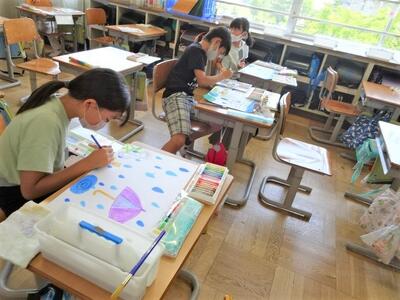 今日は、3年生の図画工作科の時間に作成していた「私の6月の絵」です。「6月」をイメージしたことを、それぞれが絵に書き表していました。「あじさい」や「かたつむり」「雨」など、子どもたちにも6月は梅雨の時期というイメージが定着していることが分かります。
