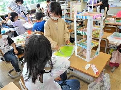 【4年生】4んせいの図工「コロコロガーレ」も完成が近づいてきました。ビー玉がしっかりと転がるようにしながら、壁やトンネルを作ったり、飾りを作ったりと、集中して取り組んでいました。試しで、ビー玉を転がしている表情が真剣でした。