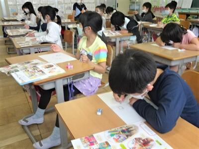 【6年生】1枚目の写真は、国語の「町のよさを伝えるパンフレットを作ろう」という単元の学習です。全体の構成を考えたり、見出しやリード文を入れたりと、学級したことを生かしてパンフレット作りを行っていました。