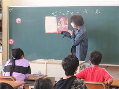 【1年生】1枚目の写真は、国語の時間に「おおきなかぶ」の朗読劇の発表の様子です。ちょうど、かぶが抜けて喜んでいる場面ですね。しっかりと台詞を言いながら動作化をすることができました。