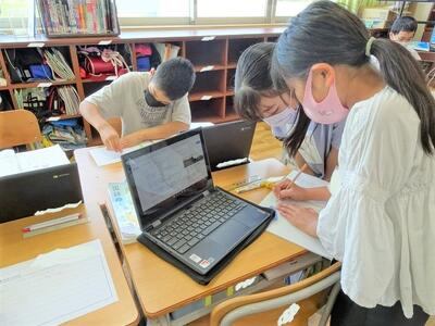 【5年生】1枚目の写真は、理科の時間に「自由研究(学校で調べていたもの)」のまとめをしている場面です。7~9枚のシートを、一つのシートにまとめていきます。子どもたちのパソコンのスキルは、上がる一方です。