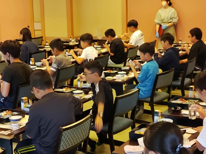 今日の宿泊場所である栄楽館に着き、夕食をいただいています。ホテルの方に到着のあいさつもできました。おかわりをして、たくさん食べていました。