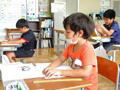 【1年生】夏休みあけ、1年生の教室では新しい教科書やドリルが配られていました。名前を書いたり、中身をチラチラと見たりしながら、先生と一緒に確認をしていました。