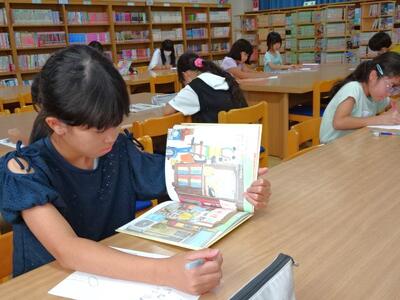 【3年生】1枚目の写真は、国語の「本はともだち」の学習の様子です。自分が選んだ本からクイズを作るのに、図書室で必要な部分の写真撮影を行いました。