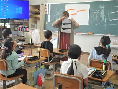 筆や硯を使った習字の学習は、3年生から始まります。本校では、3年生の書写の時間の何時間かを、専門家をお呼びして教えてもらっています。5月に6日(金)と9日(月)には、2時間ずつ早速専門家の先生に来ていただきました。この日は、道具一つ一つの使い方や片付けの仕方、筆の取り扱いなどについて教わりました。習字の学習の一番の基本です。子どもたちは、集中して姿勢良く、取り組んでいました。