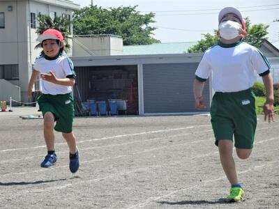 【1年生】2枚目の写真は、6年生に手伝ってもらいながら、シャトルランの想定をした時の写真です。6年生に付き添ってもらいながら、自分の力をしっかり出して走っていました。
