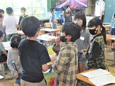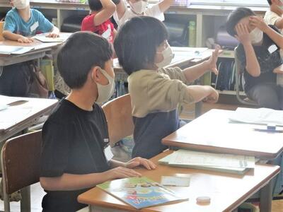 【3年生】1枚目と2枚目の写真は、外国語活動の授業の様子です。「元気」や「眠い」「悲しい」などの相手の状態を聞いたり答えたりする内容です。子どもたちは、すぐに会話の仕方を覚えて、進んで友達と会話の練習をしていました。