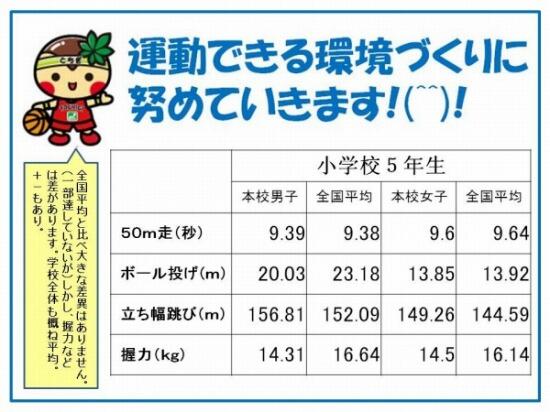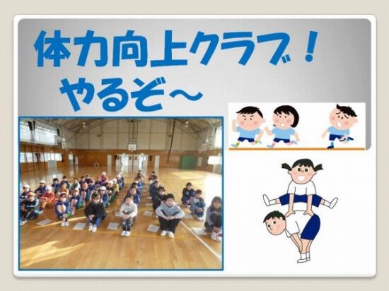 本校では現在、「めあてをもった体力づくり」を重点目標の一つに掲げ、授業の中での体力づくりを中心に、授業外でもカードを使ったり、体力づくりタイム(持久走等)を季節ごとに設定したりして取り組んでいるところです。1月からは4~6年生を対象に体力向上部が活動を始めます。今後とも体力つくりの啓発・実践に努めていきたいと思います(^_^)v