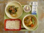さて、冬休み明け最初の給食です。メニューに何をもってくるかと思っていましたが、カレーです。栄養士は初めはやはり子どもの人気メニューからと考えていたようです。TVでおせち料理に食べ飽きて、正月過ぎに意外と人気となるメニューにカレーが挙げられていました。今日はチキンです。取り合わせは、これも相性よいこんにゃくサラダとヨーグルトです。2週間ぶりの給食に舌鼓を打ちました。ごちそうさまです(^-^)