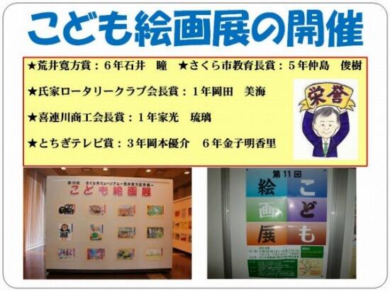 すでにHP等でお知らせをしていますが、現在「さくら市こども絵画展」が喜連川庁舎で開催されています。明日は最終日となり、表彰式(喜連川公民館)が行われます。リーフレットに本校児童2名の作品が掲載されています。子どもたちの力作をご覧ください(@_@)