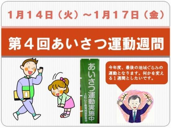 今日も青空の広がるいい天気となりました。明日からまた学校が始まりますが、今週は第4回目のあいさつ運動週間となります。子どもたちのあいさつについては、何回か話をしていますが、まだまだとの評価を受けています。冬休み明けの集会では子どもたち、そして教職員にも「あいさつについては何かを変えよう。」と話をしました。あいさつは日常の基本的なものですが、この一週間は特に力を入れていきたいと思います。保護者・地域の皆様のご協力よろしくお願いします(^_^)v