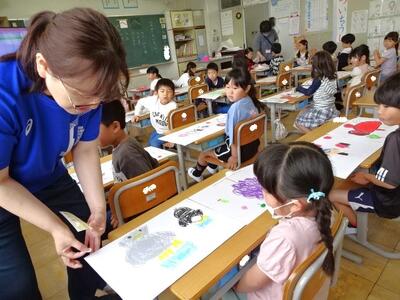 【1年生】1枚目と2枚目の写真は、図画工作の「わたしのおひさま」の学習の様子です。「おひさま」から感じたことや想像したことを、好きな色や形で描いていきます。いろいろなおひさまができました。