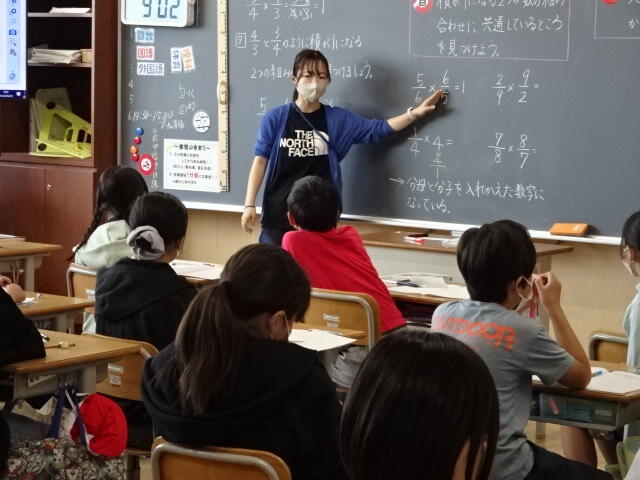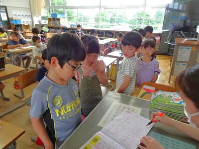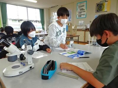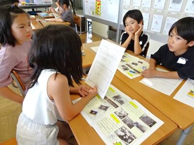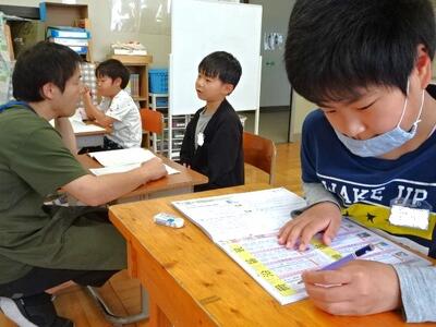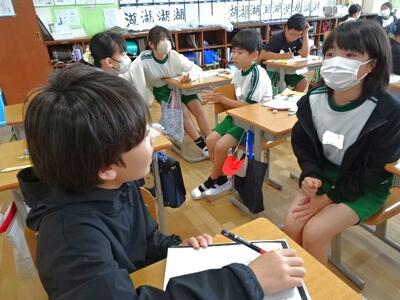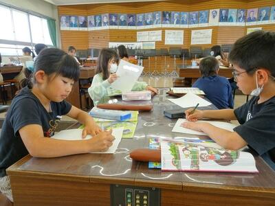【5年生】1枚目の写真は、午前中に行った「陸上記録会」の自分の記録を知り、振り返っている様子です。自己ベストを更新した子どもたちがたくさんいました。「陸上記録会」の様子については、明日の午前中にHPにアップします。