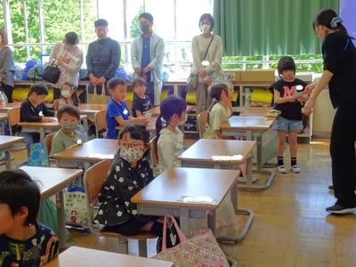 【1年生】明日は、小学校で最初の授業参観の日です。明日、上手に発表ができるように、絵を見せながら自己紹介をする練習を行いました。