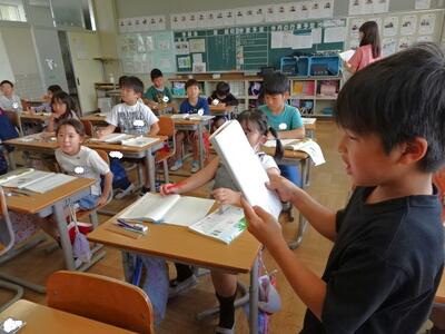 【2年生】1枚目の写真は、国語の「スイミー」の学習の様子です。今日は、大きな魚を追い払う作戦を立てている場面の学習です。たまたま赤いTシャツを着ていってしまったために、スイミーと同じ色だと騒ぎになってしまいました。ごめんなさい。