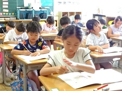 【3年生】今日は、書道の専門の先生がいらっしゃる日で、子どもたちはこの日を楽しみにしています。今日は、横画の練習をしたり、小筆の使い方を習ったりしました。